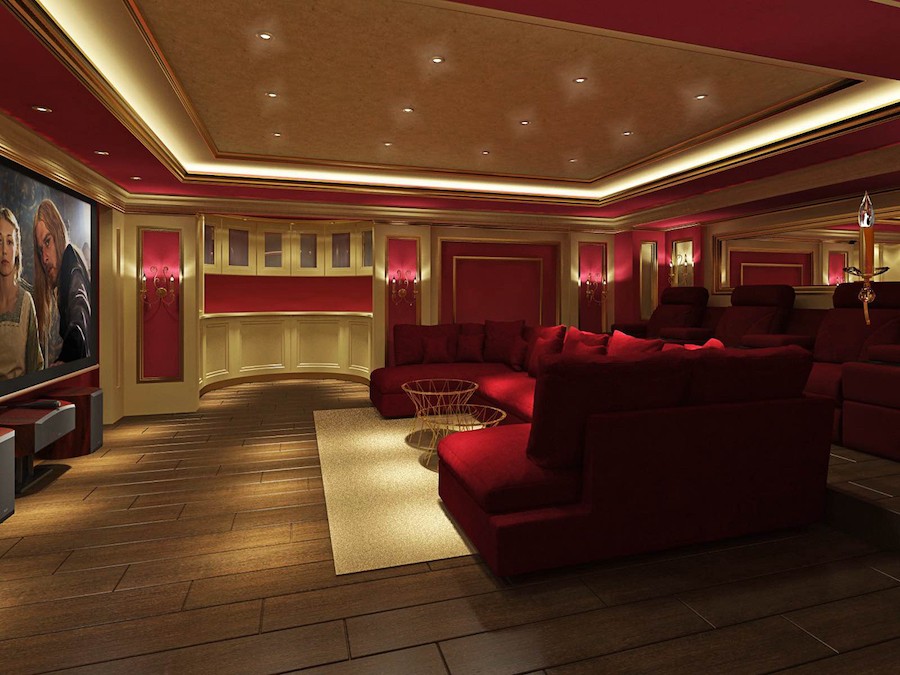 red and gold themed home theater with red luxury seating and twinkling star ceiling panels
